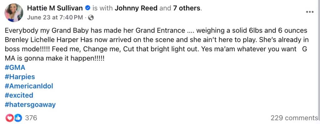 On June 23, Sullivan wrote, “Everybody my Grand Baby has made her Grand Entrance …. weighing a solid 6lbs and 6 ounces Brenley Lichelle Harper Has now arrived on the scene and she ain’t here to play. She’s already in boss mode!!!!! Feed me, Change me, Cut that bright light out. Yes ma’am whatever you want G MA is gonna make it happen!!!!!”