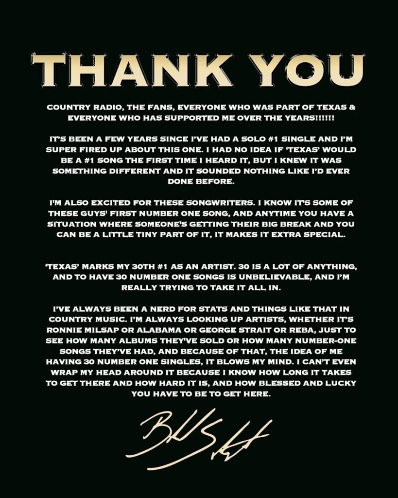Shelton wrote in a thank you note to his fans, “‘Texas’ is my 30th #1 as an artist. 30 is a lot of anything, and to have 30 number one songs is unbelievable, and I’m really trying to take it all in.”