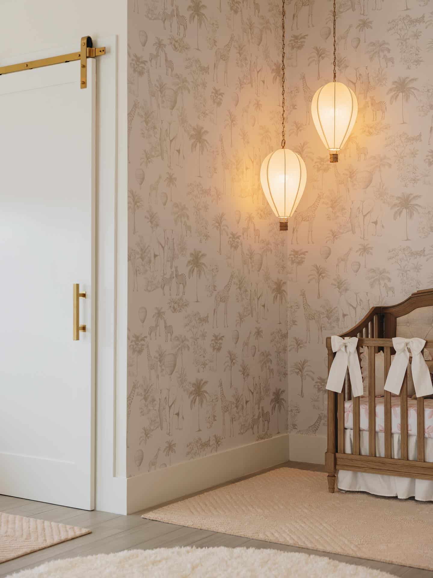 The room is covered in custom wallpaper designed by Cara Saven Wall Design. The pattern offers a subtle nod to Demi’s home country, South Africa, with illustrations of African animals, hot air balloons, and palm trees.