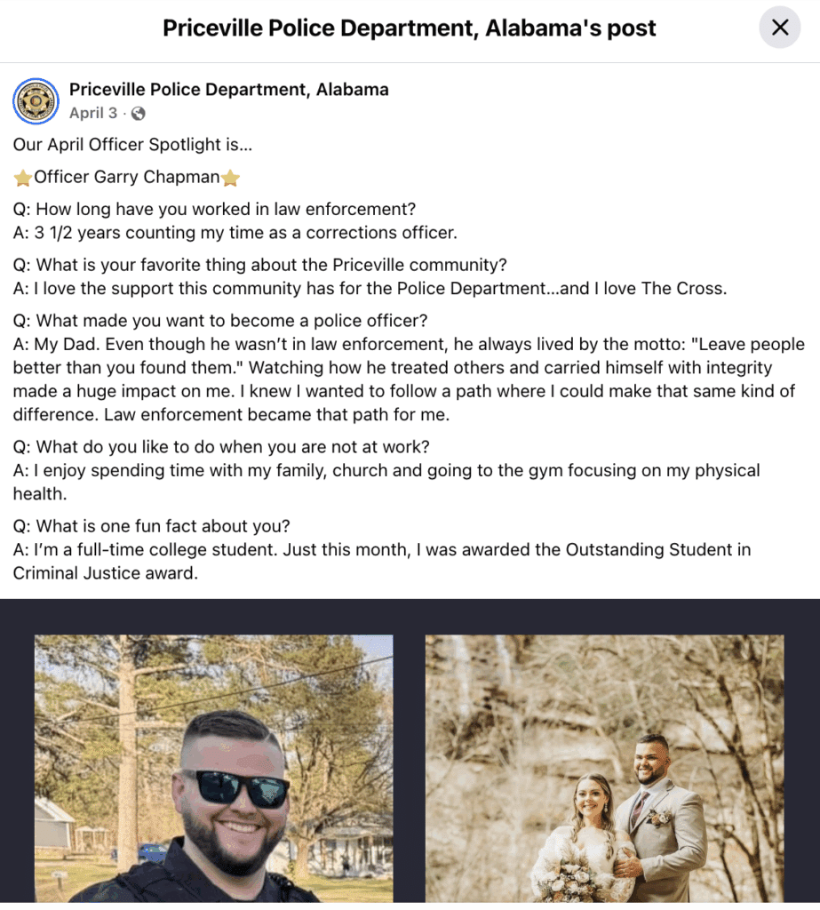 The Priceville Police Department featured Garry as the subject of its April Officer Spotlight, allowing for Garry to write responses to questions about himself and his role in law enforcement.