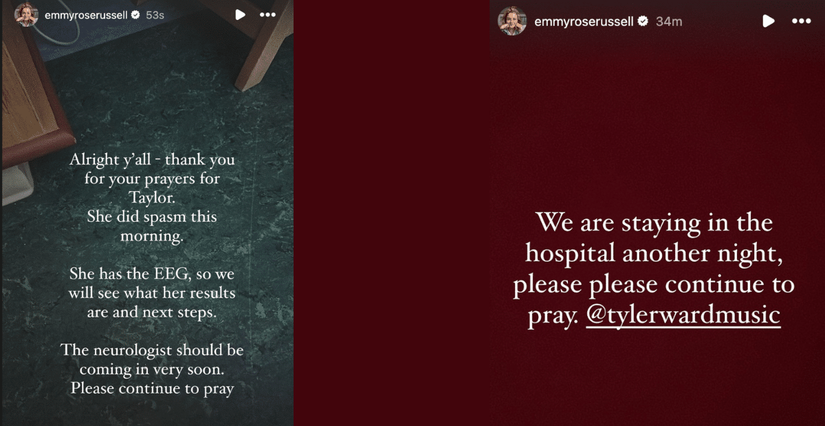 In the first, Emmy thanked her followers for sending their prayers. She shared that Taylor “did spasm” again that morning. She was undergoing an EEG, and they were waiting on the results and “next steps” after that.