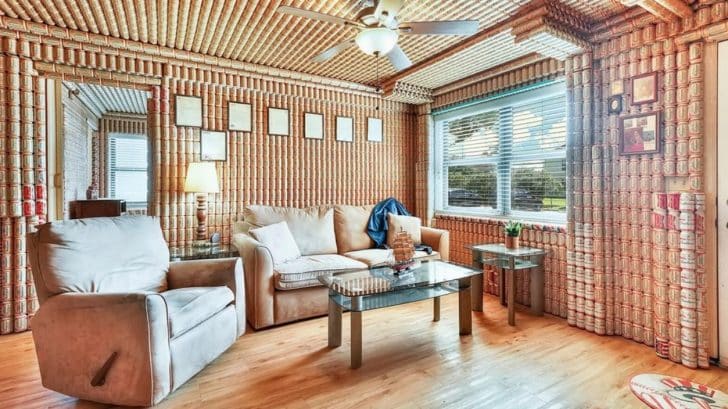 The home’s interior walls and ceilings are completely covered in Budweiser beer cans. Apparently, the guy who previously lived there was one of Budweiser’s biggest fans and decorated the place with thousands of cans to show his love for the beer.