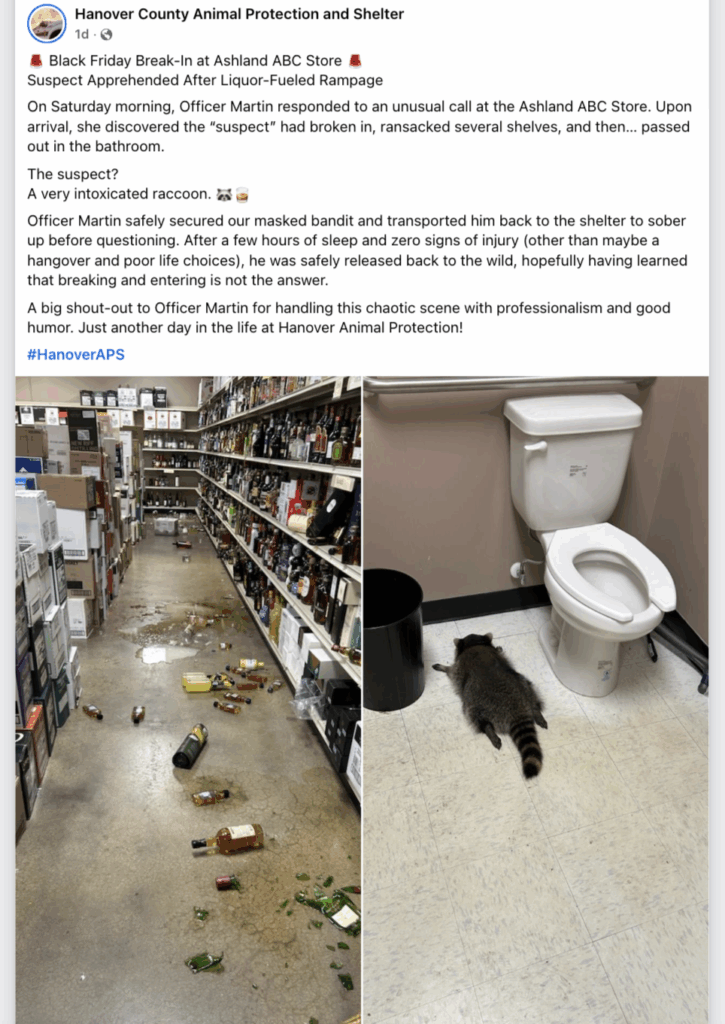 Posting to social media, the Hanover County Animal Protection and Shelter shared that a liquor store in Ashland was “ransacked” by a “very intoxicated” raccoon.