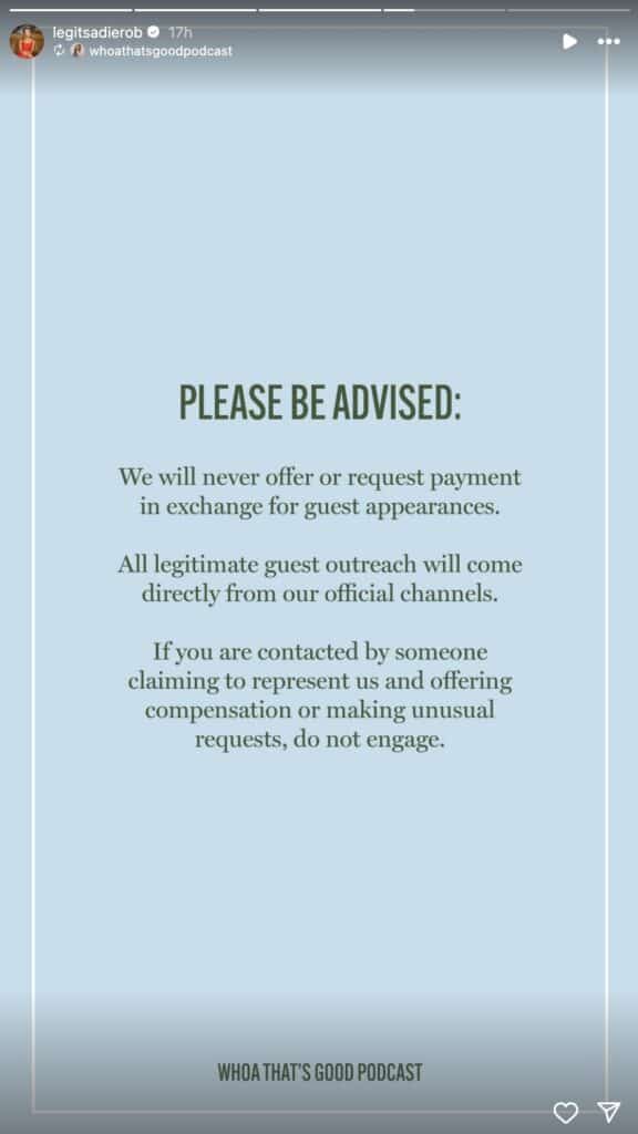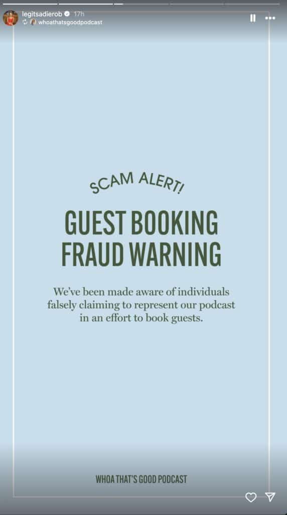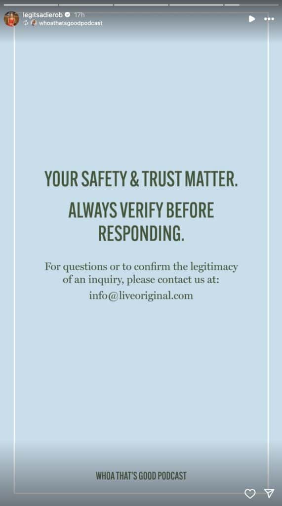 Sadie and the WHOA That’s Good team advised listeners not to engage with those falsely claiming to be connected to the podcast.
