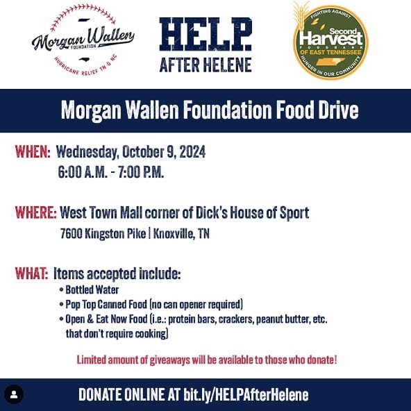 In addition to hosting the food drive, Wallen is also selling “HELP” T-shirts on his website. All proceeds from the T-shirt sales will be donated to Second Harvest of East Tennessee and MANNA FoodBank of Western North Carolina to help with Hurricane Helene relief.