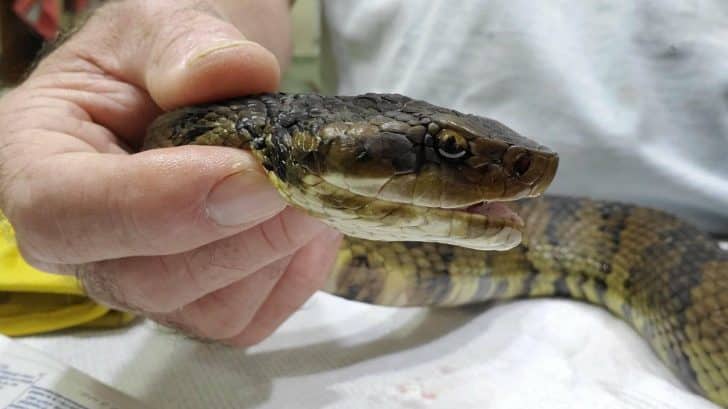 The goal of the rehabilitation center is to restore animals to good health, then release them back into the wild. They shared that they found this specific water moccasin stuck in a thorn bush and rescued her. She had several wounds from the thorns so they took her back to the center to doctor her up.